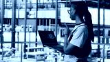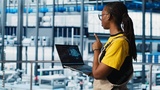 Engineer in smart factory using augmented reality to collect data on laptop. Professional on platform in industry 4.0 industrial plant equipped with sensors using AI technology, camera A