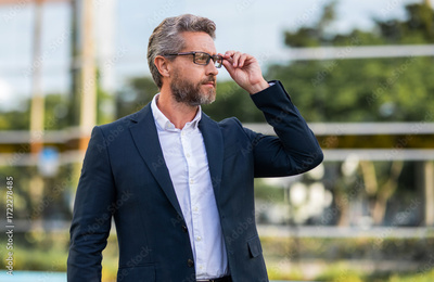 Successful businessman in suit, banner. Leadership and success. Business success. Professional entrepreneur expressing success. Mature Hispanic businessman. Business man outdoor portrait