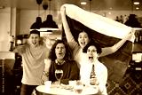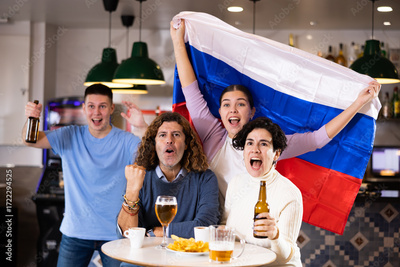 Emotional young adult sports fans supporting Russian team with flag while resting in pub with beer