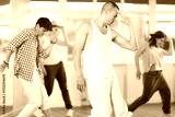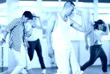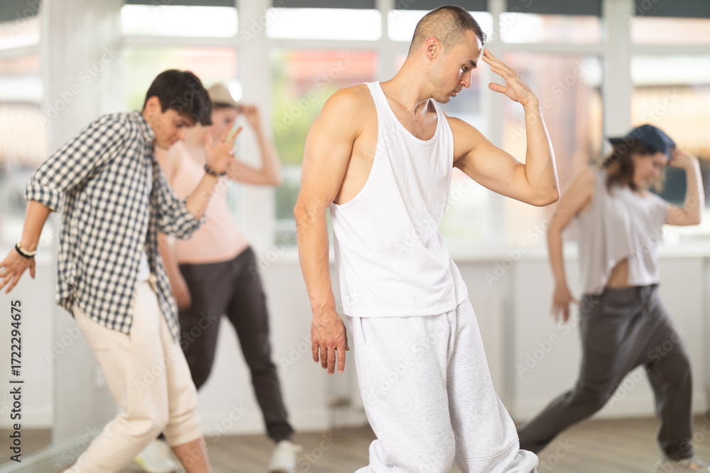 Young man standing performs basic hip hop movements in front of group of students. Developing precise movements, rehearsing arc elements, nae nae moving