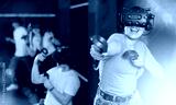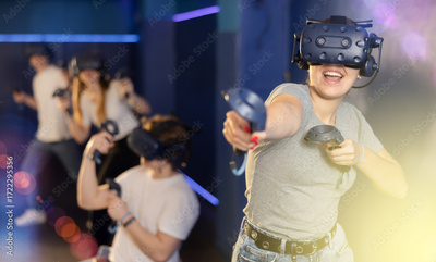Cheerful emotional young woman in VR headset fully immersed in game, actively engaged in virtual reality world, manipulating objects or shooting targets with joysticks in hands..
