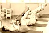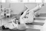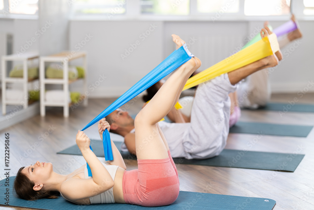 Slender young girl doing press with resistance band on legs lying on the floor in pilates studio in group