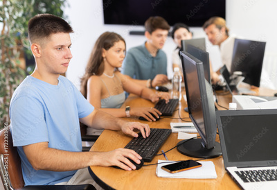 Focused guy student of computer courses types on keyboard, performs work, educational practical task