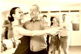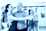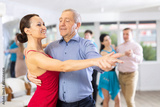 Smiling senior man and young woman dancing slow ballroom dance during group class in choreography studio..