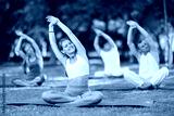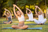 Enthusiastic young female yoga instructor leading outdoor group class in tranquil setting amidst lush greenery of city park, performing stretching exercises in Padmasana pose