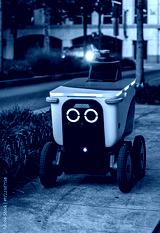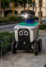 Autonomous delivery robot on Atlanta street at night with headlights and glowing eyes