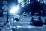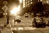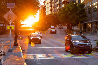 Cars driving through sunlit Atlanta street during golden hour with urban buildings around