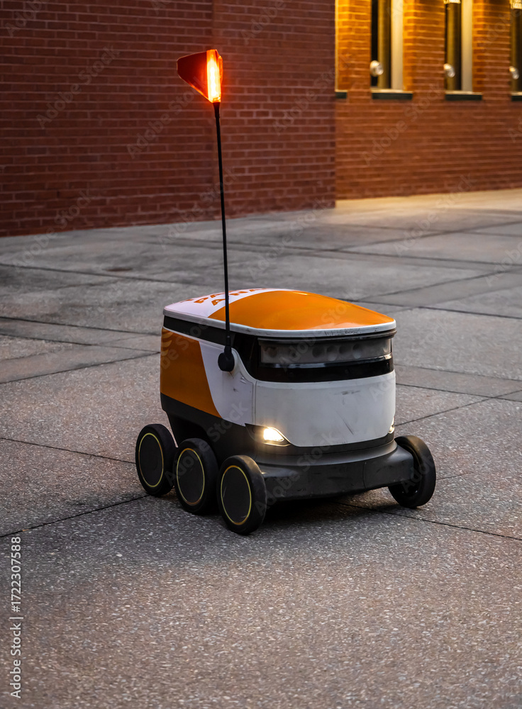 Autonomous delivery robot on Atlanta street at night with headlights and glowing eyes