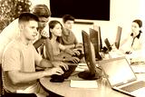 In classroom during computer courses, male teacher helps guy student complete difficult task, looks at monitor screen and corrects work