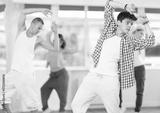 Positive young man engaged in hip-hop together with other attendees of dancing courses for beginners