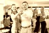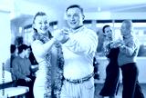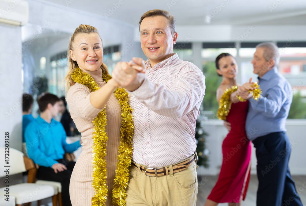 Positive stylish woman and man in New Year attires, dancing waltz as couple during holiday eve gathering in office or dance studio ..