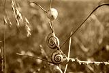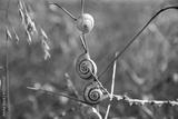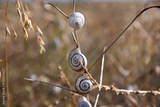 Several snails gathered on the grass in an oat field in summer. A European snail species with round shells.