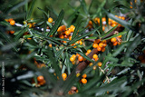 Bright orange sea buckthorn berries on a green-leafed bush on a sunny day in the garden. Close-up photo with selective focus. (Hippohae)