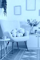 Stylish armchair with cushion in room. Interior design