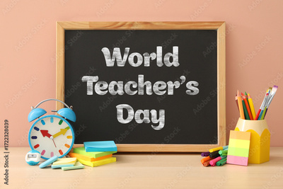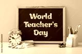 Happy Teacher's Day greeting card with stationery and text on small chalkboard
