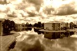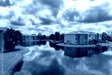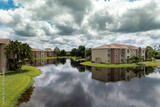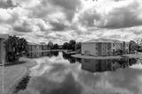Family houses with retention ponds to prevent flooding in Florida closed suburban area. Real estate development in American suburbs