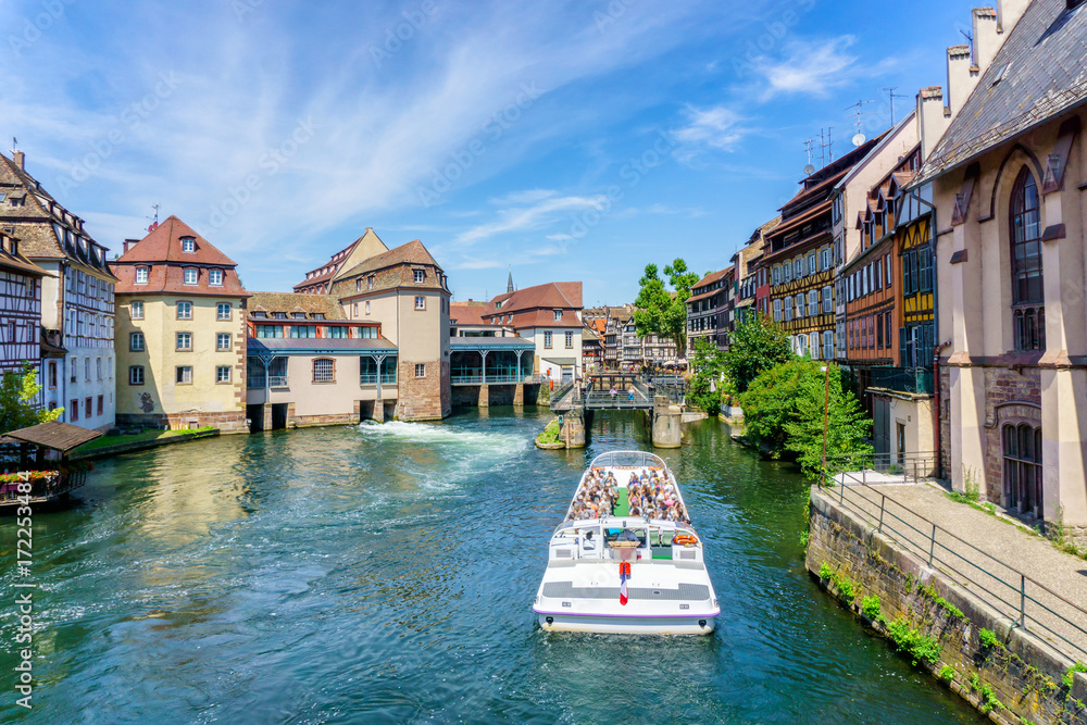Traditional colorful houses in La Petite, with tourists taking a boat ride along traditional colorful houses on idyllic river Lauch in summer, Colmar, Alsace, France