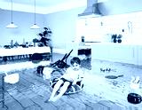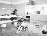 A young boy floats in an inflatable ring inside a flooded modern kitchen. Surreal scene of a domestic disaster with water damage. Home insurance and emergency concept.