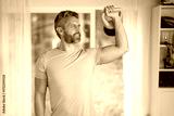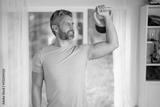 Middle-Aged Man Lifting Kettlebell at Home. Fit Latin Man Exercising with Weights. Mature Man with Kettlebell Indoors. 40s man Lifting kettlebell. Morning Exercises. Training with Kettlebell.