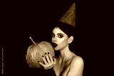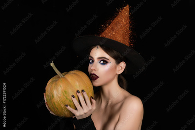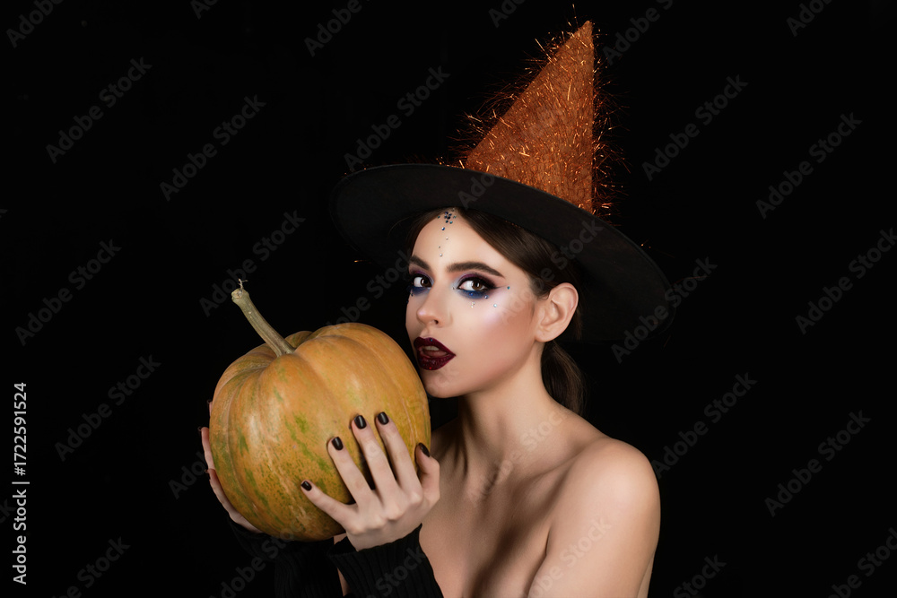 Halloween sexy woman portrait. Halloween sensual girl in witch hat. Halloween pretty sexy woman face with makeup. Halloween beauty sexy girl portrait holding pumpkin.