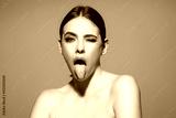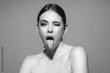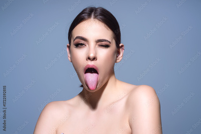 Model sticking out tongue. Woman tongue. Female face expression. Model showing tongue. Funny and flirty facial gesture with tongue. Funky emotion. Funny and flirty mood.