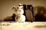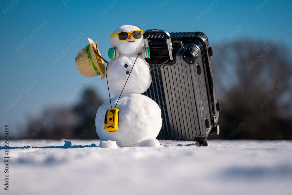 Snowman traveler with suitcase on winter vacation. Festive snowman with luggage. Outdoor snowman on New Year travel adventure. Snow man tourist with bag for winter trip. Snowman with travel baggage.