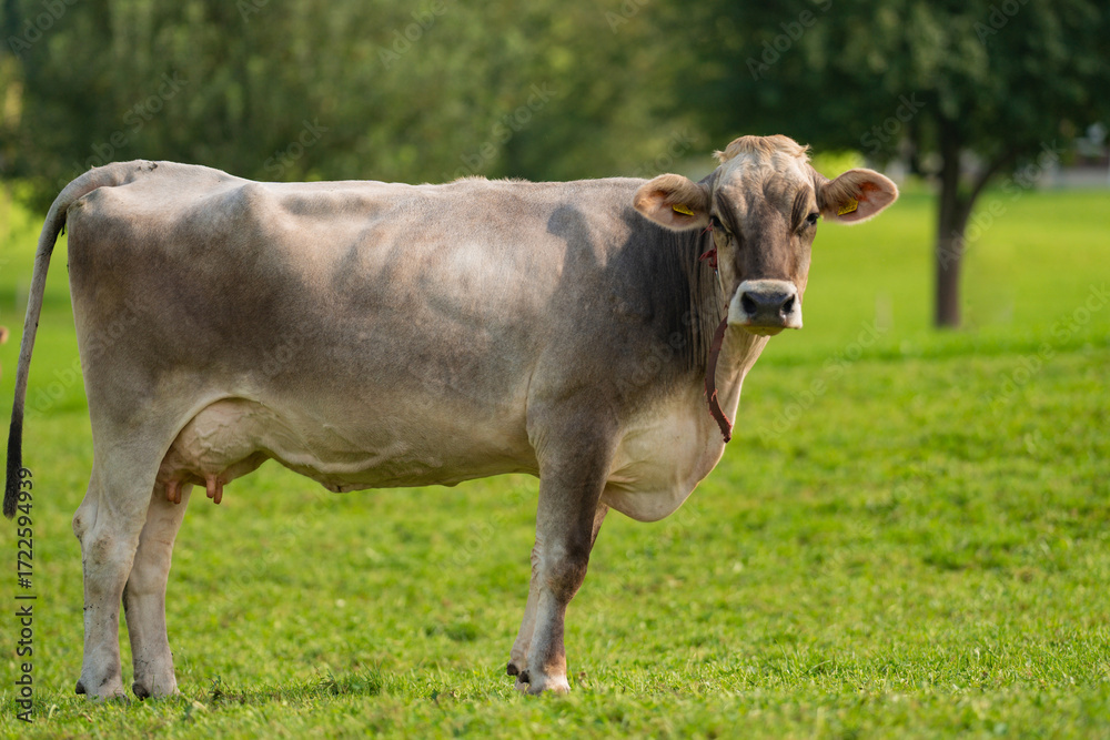 Cow grazing in a green pasture. Cow in the meadow. Livestock grazing in the countryside. Farm life with cattle and calves. Cow in a rural landscape. Ranch with grazing bovine. Dairy cow.
