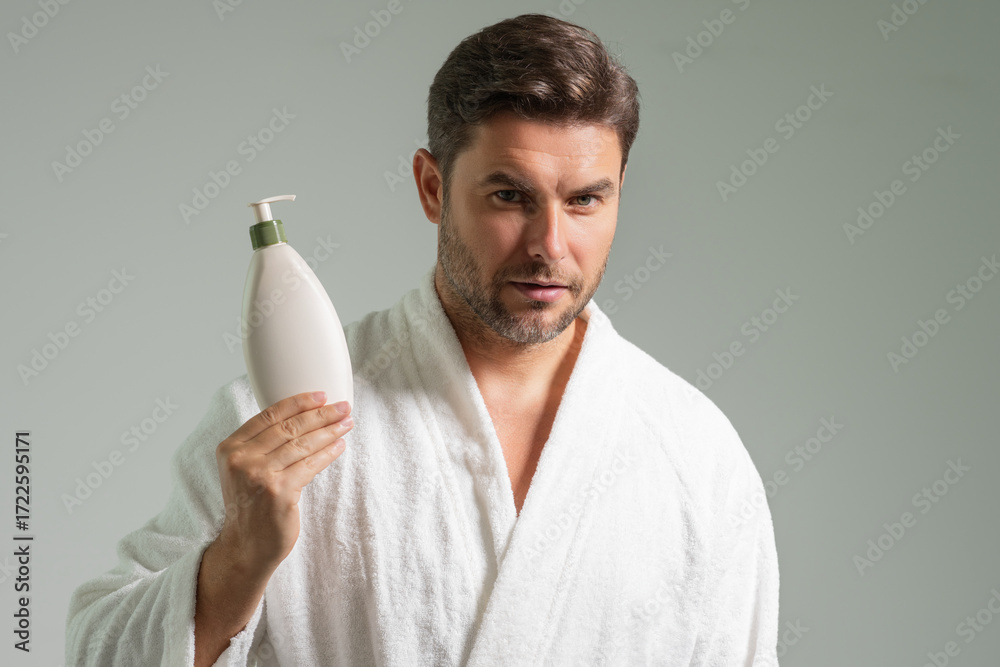 Man with bottle of cosmetic products. Beauty man hold cosmetic bottle. Cosmetics cream for skincare. Spa beauty products. Man advertising new cosmetic product. Male model promoting cosmetic bottle.