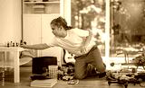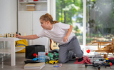 Child cleaning toys in playroom. Kid cleaning scattered toys on the floor. Kid cleaning children messy room. Teen cleaning untidy playroom interior. Kid picking up toys in messy room.