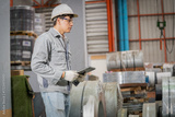 Industrial worker managing equipment factory floor action scene indoor environment side view safety protocols