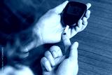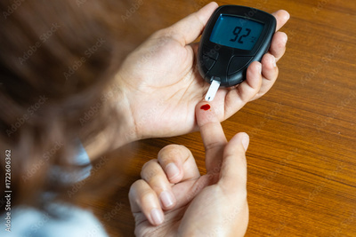 hand of people check diabetes and high blood glucose monitor with digital pressure gauge. Healthcare and Medical concept