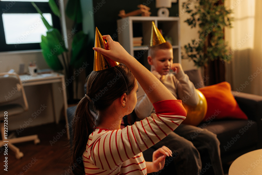 Girl and Boy Wearing Party Hats Celebrating at Home