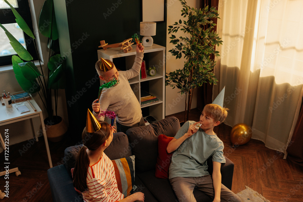Children celebrating birthday party at home blowing party horns and dancing