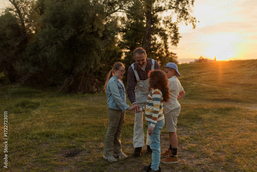Farmer Joining Hands with Children, Promoting Sustainable Living at Sunset