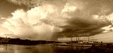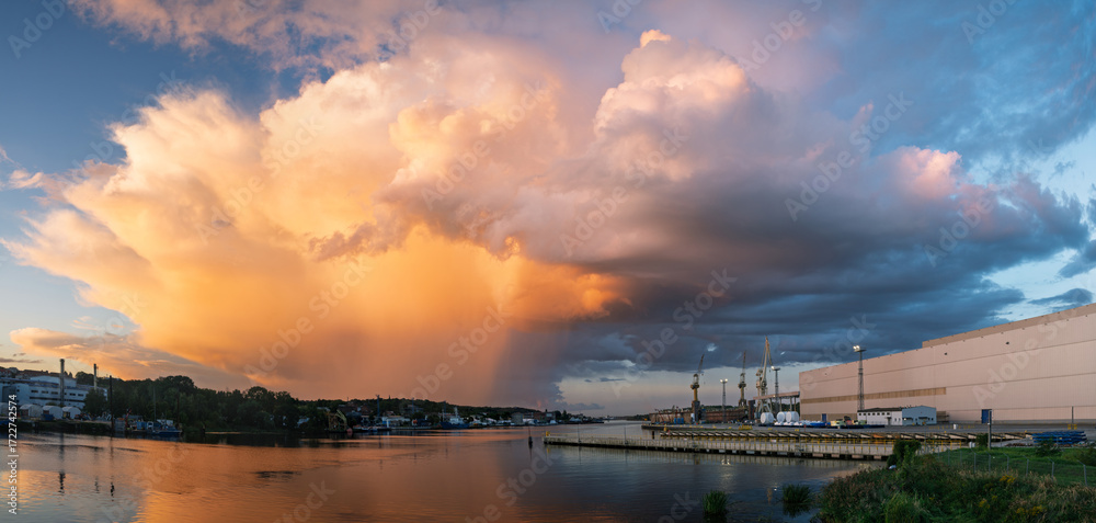 An evening storm passing over the port area illuminated by the setting sun