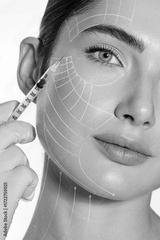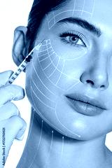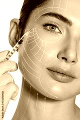 Beauty injections, lifting lines on a woman's face, advertising of skin tightening. Injections in eye area, nasolabial folds, forehead