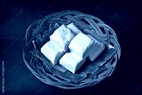 Organic tofu arranged on a rattan tray. Isolated on a black board
