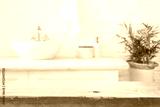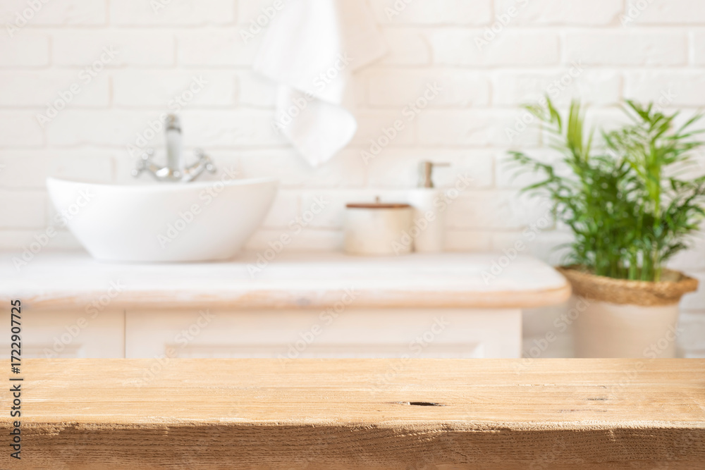 Aged lightly lit wooden table top in front of rustic blurred bathroom interior background