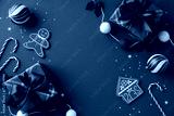 Festive Christmas scene features wrapped gifts, cookies, candy canes and ornaments scattered on a green backdrop, creating a cheerful holiday mood suitable for New Year greeting and celebration