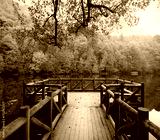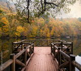 Yedigöller National Park in the morning. The famous wooden pier on the large lake. A symbolic photograph of autumn in Turkey. Bolu, Turkey