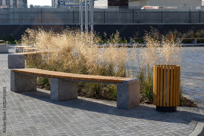 Benches and trash can next to pampas grass landscaping. Functional urban furniture with a concrete base and wooden seats for public seating areas. Photo