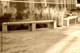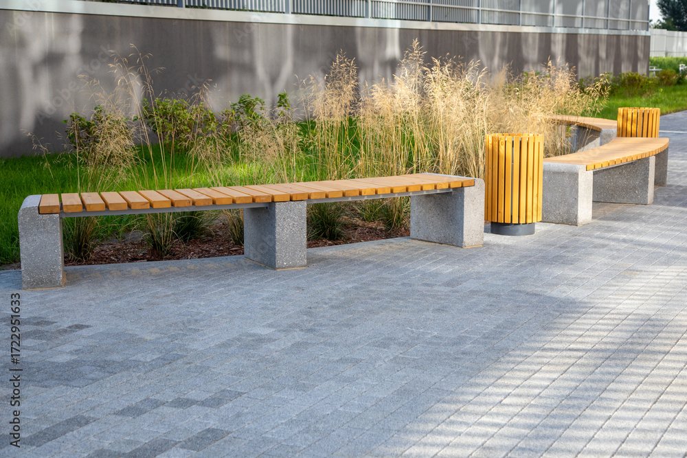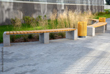 Well-maintained urban recreation zones concept. Stylish outdoor seating and waste container on paved ground with greenery. Photo