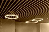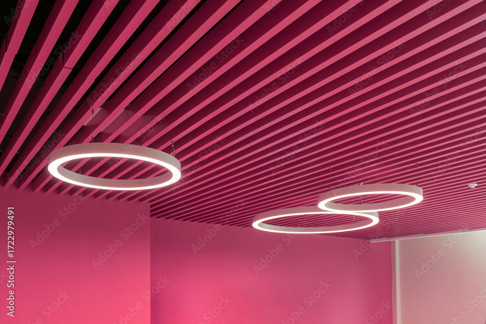 Bold pink ceiling with slatted design and circular lights. Modern interior for retail, lounge, or creative space. Real photo