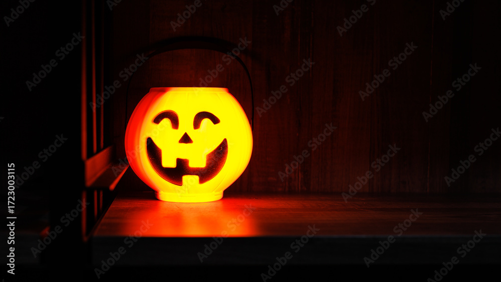 Decoration props orange pumpkin jack o lantern bucket funny glowing face on black background standing prominently against dark for Halloween concept, happy ghost carnival holiday festival celebration.