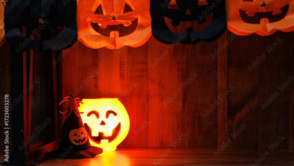 Halloween decorations with orange pumpkin jack o lantern bucket glowing face, lanterns smiling garlands flags prop DIY paper craft parts witch hat in dark black background ideal for seasonal festive.