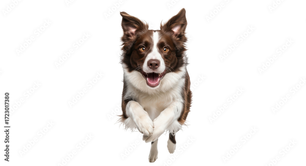 Isolated brown border collie dog running with mouth open and paws forward in studio