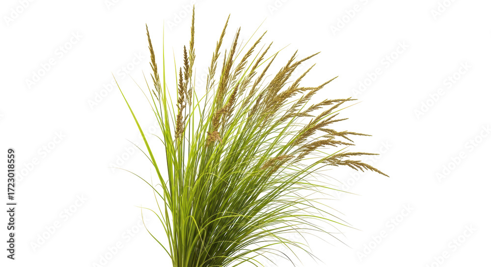 Isolated decorative ornamental grass plant, tufted perennial herb with linear leaves, no background