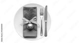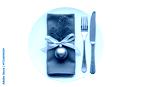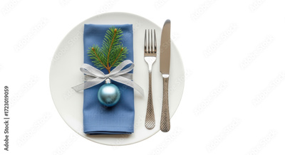 Isolated festive table setting featuring a blue napkin, ornament, knife, and fork for Christmas