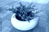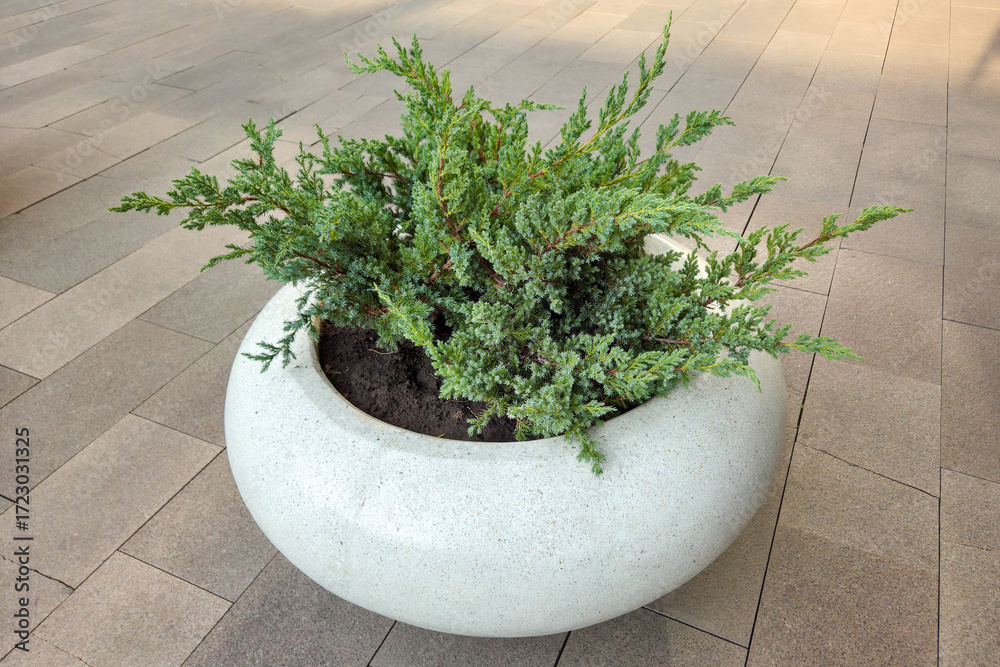White round cement-concrete vase with decorative juniper shrub on a paved path. Design, urban landscaping for public or commercial space. Real photo