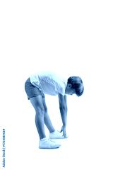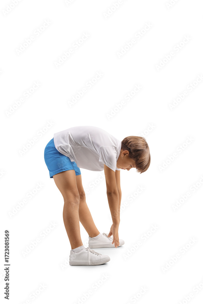 Full length profile shot of a boy stretching and touching toes